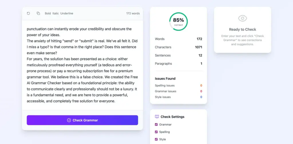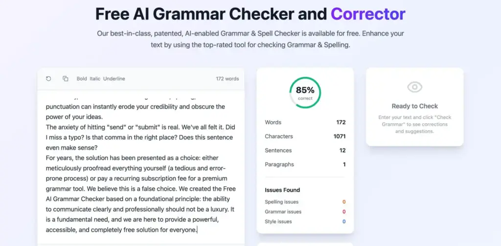 That’s why we created the Free AI Grammar Checker 🤖. For years, the choice was either to proofread everything yourself ⏳ (tedious and error-prone) or pay for premium grammar tools. We believe that’s a false choice. Clear communication is not a luxury—it’s a fundamental need. Our tool makes professional, polished writing powerful, accessible, and completely free for everyone.